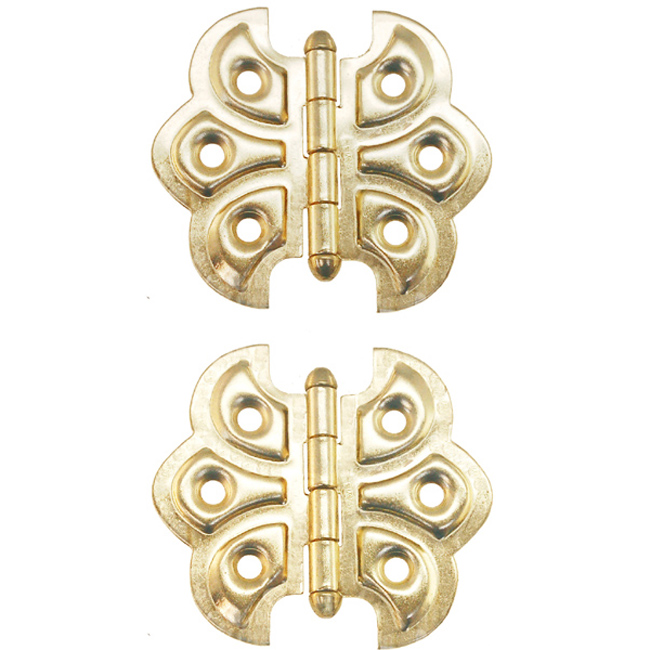 1560-PB Ornamental, embossed “butterfly” hinges Finish/Color: Polished BrassMaterial: steelDimensions: 2-3/8" X 2-1/4"Finish Options: AB | AC | OB | PB | PNTimeline: Early 20th Century SKU: 1560-PB-1732 Categories: Hinges, Steel Tag: Polished Brass Description Description Embossed ornamental hinges have been very common for furniture and cabinets since the late 19th century onward. Made of steel. Full surface, flush mount hinges. 2-3/8″ X 2-1/4″ Sold in pairs.