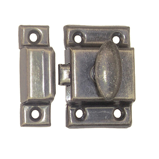 1617-AB Utility Latch & strike for cabinet doors – small Finish/Color: Antique Brass finishMaterial: SteelDimensions: 1-1/4" + 5/8" X 1-7/8"Finish Options: AB | AC | PB | PN | OBTimeline: Early 20th CenturyFeatures: Inexpensive utility latch SKU: 1617-AB Categories: Latches, Steel Tag: Antique Brass finish Description Description A utility latch for “Country” or rustic furniture. Widely used on pine or patio furniture. Made of stamped steel. Comes in 5 finishes and 2 sizes. This is the smaller size. Latch: 1-1/4″ X 1-7/8″ Catch: 5/8″ X 1-7/8″