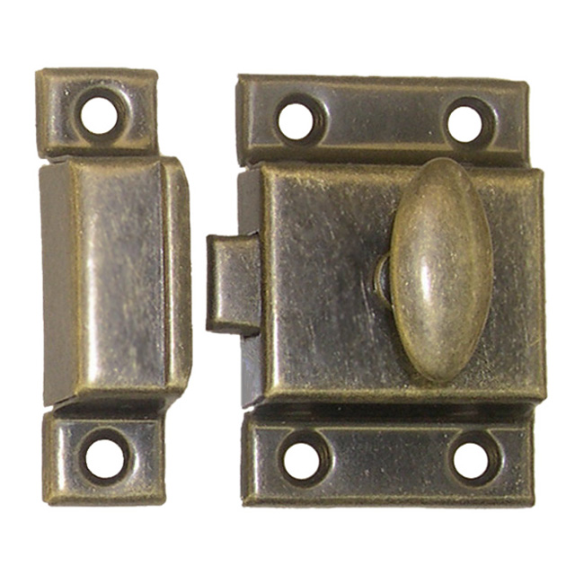 1618-AB Utility Latch & strike for cabinet doors – large Finish/Color: Antique BrassMaterial: SteelDimensions: 1-1/2" + 5/8" X 2-1/8"Finish Options: AB | AC | PB | PN | OBTimeline: Early 20th CenturyFeatures: Inexpensive utility latch SKU: 1618-AB Categories: Latches, Steel Tag: Antique Brass Description Description A utility latch for “Country” or rustic furniture. Widely used on pine or patio furniture. Made of stamped steel. Comes in 5 finishes and 2 sizes. This is the larger size. Latch: 1-1/2″ X 2-1/8″ Catch: 5/8″ X 2-1/8″