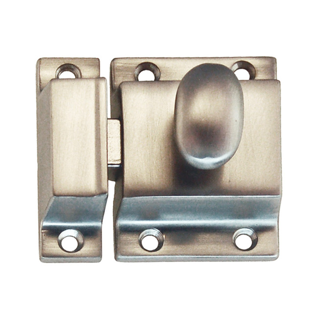 1619-BN Solid brass forged cabinet door latch and strike – large Finish/Color: Brushed NickelMaterial: Solid BrassDimensions: 1-5/8" + 5/8" X 2-1/8"Finish Options: BN | PB | PN | OBTimeline: Early 20th Century SKU: 1619-BN-1210 Categories: Latches, Latches Tag: Brushed Nickel Description Description Highest quality cabinet door latch. Die cast brass. In 4 finishes: PB, BN, PN, OB. This solid brass latch is a timeless addition to any kitchen, bathroom, or furniture it adorns. Latch: 1-5/8″ X 2-1/8″ Catch (strike): 5/8″ X 2-1/8″