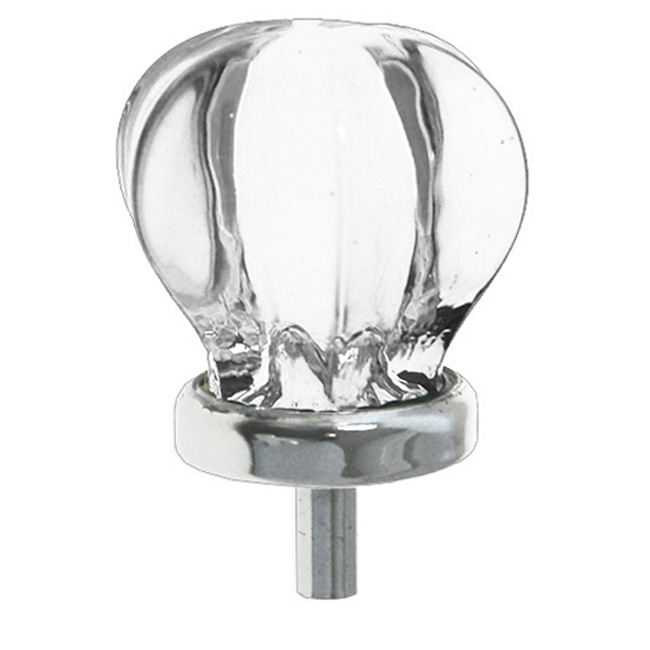 Six point star-shaped glass knob with a brass base and shank. We offer 3 sizes of the knob and a corresponding glass handle. The clear glass knobs and handle are available with 2 base Finishes: polished brass and polished nickel. This is the medium knob with the polished nickel base.