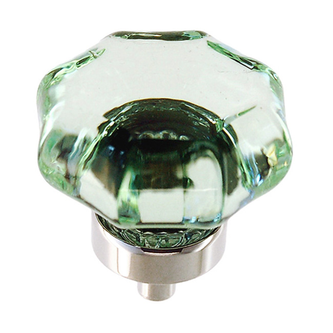 Octagonal glass knob with brass base. Available in 2 sizes: 1″ dia. , 1-1/4″ dia. and in 6 colors: clear, amethyst, translucent white, Depression green, amber and black. Each knob is available in 4 base finishes: Polished Brass, Polished Nickel, Brushed Nickel, Oil rubbed Bronze. Please specify base finish when ordering. This is the medium size.