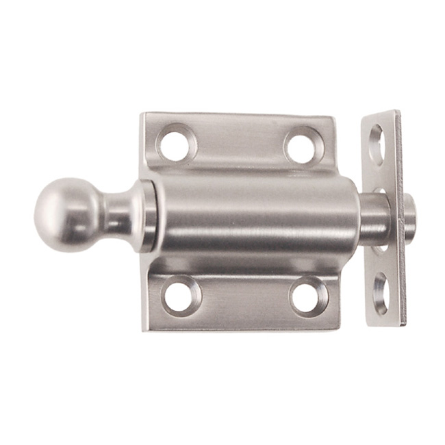 8716-BN Sash ventilating bolt Finish/Color: Brushed NickelMaterial: Solid BrassDimensions: 1-3/16" x 1-1/4"Finish Options: PB | PL | PN | BN | OB | AB SKU: 8716-BN Categories: Sash Window, Window Hardware, Window Hardware Tag: Brushed Nickel Description Description Sash ventilating bolt with three strikes. Spring loaded bolt that can be kept retracted. Solid Brass. Available in six finishes. Body: 1-3/16″ x 1-1/4″ Bolt: 2-1/4″ long, 5/16″ diam.
