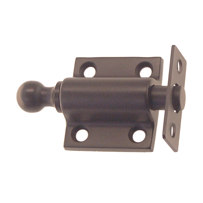 8716-OB Sash ventilating bolt Finish/Color: Oil rubbed BronzeMaterial: Solid BrassDimensions: 1-3/16" x 1-1/4"Finish Options: PB | PL | PN | BN | OB | AB SKU: 8716-OB Categories: Sash Window, Window Hardware, Window Hardware Tag: Oil rubbed Bronze Description Description Sash ventilating bolt with three strikes. Spring loaded bolt that can be kept retracted. Solid Brass. Available in six finishes. Body: 1-3/16″ x 1-1/4″ Bolt: 2-1/4″ long, 5/16″ diam.
