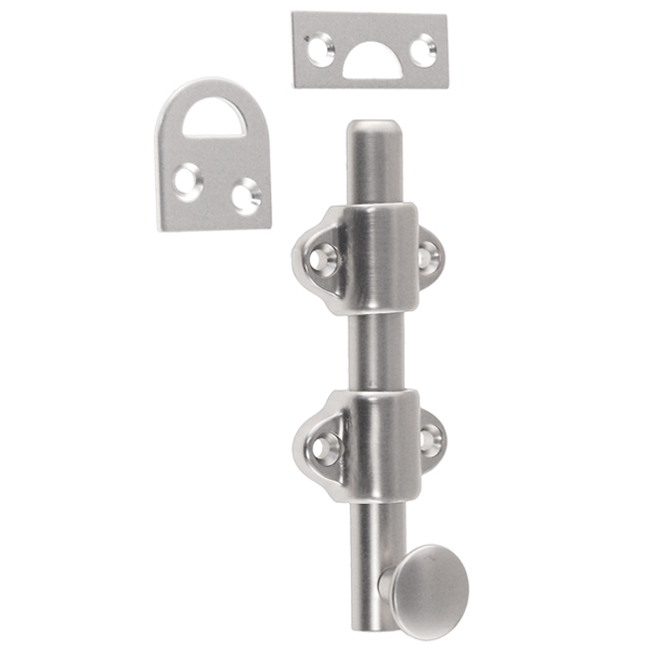 8720-BN Surface bolt Finish/Color: Brushed NickelMaterial: Solid brassDimensions: 4" longFinish Options: AB | PB | PN | OB | BN SKU: 8720-BN-845 Categories: Surface Bolts, Surface Bolts, Window Hardware, Window Hardware Description Description Surface bolt for windows, French windows, doors. Solid brass. Available in 3 lengths and 5 finishes. Comes with 2 strikes. 4″ long , 1/2″ diameter half-rod 1-3/8″ wide guide brackets (stays) , 3/4″ knob diameter