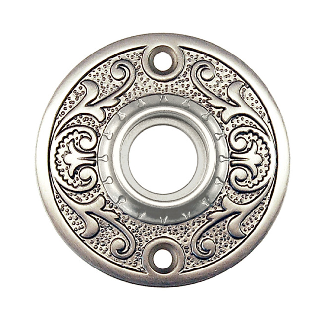 8743-BN Doorknob rose Finish/Color: Brushed NickelMaterial: Solid brassDimensions: 2-3/16" diameterFinish Options: BN | PB | PN | OB | PLTimeline: Late 19th century onward SKU: 8743-BN-542 Categories: Door Roses, Door Roses Description Description Doorknob rose. Forged brass. With floral pattern. Comes in 5 finishes. 2-3/16″ diameter , 3/4″ hub dia. , 1-11/16″ center to center