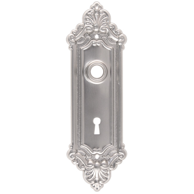 8762-K-BN Wrought brass trim plate (escutcheon) for doors Finish/Color: Brushed NickelMaterial: Solid BrassDimensions: 2-3/8" X 8-1/2"Finish Options: BN | PB | PL | PN | OBTimeline: Late 19th Century, Early 20th Century SKU: 8762-K-BN-432 Category: Door Plates Tag: Brushed Nickel Description Description Beautiful door trim (escutcheon) plate with intricate detail. Wrought brass. In 5 Finishes: PB, PL, PN, BN and OB. 8-1/2″ high , 2-3/8″ wide (2-3/4″ at widest). 2-1/4″ spacing (hub to keyhole)