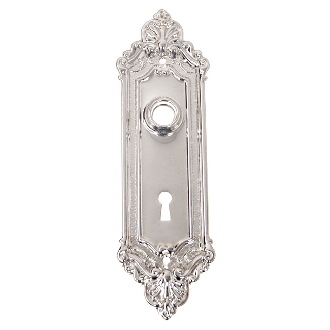 8762-K-PN Wrought brass trim plate (escutcheon) with keyhole for doors Finish/Color: Polished NickelMaterial: Solid BrassDimensions: 2-3/8" X 8-1/2"Finish Options: BN | PB | PL | PN | OBTimeline: Late 19th Century, Early 20th Century SKU: 8762-K-PN-436 Category: Door Plates Tag: Polished Nickel Description Description Beautiful door trim (escutcheon) plate with intricate detail. Wrought brass. In 5 Finishes: PB, PL, PN, BN and OB. 8-1/2″ high , 2-3/8″ wide (2-3/4″ at widest). 2-1/4″ spacing (hub to keyhole)