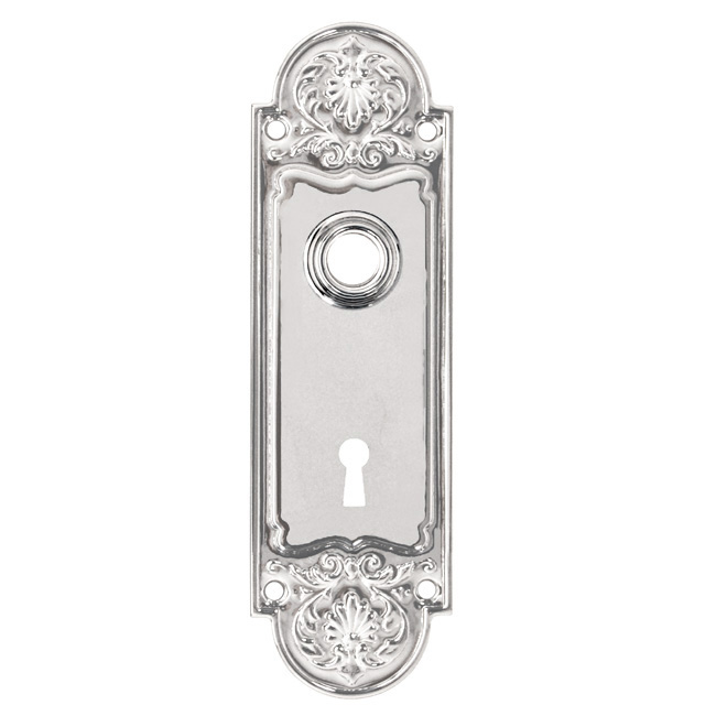 8763-K-PN Wrought brass trim plate (escutcheon) with keyhole for doors Finish/Color: Polished NickelMaterial: Solid BrassDimensions: 2-3/8" X 7-5/8"Finish Options: BN | PB | PL | PN | OBTimeline: Late 19th Century, Early 20th Century SKU: 8763-K-PN-446 Category: Door Plates Tag: Polished Nickel Description Description Graceful door trim (escutcheon) plate with elaborate detail. Wrought brass. In 5 Finishes: PB, PL, PN, BN and OB. 7-5/8″ high , 2-3/8″ wide 2-1/4″ spacing (hub to keyhole)