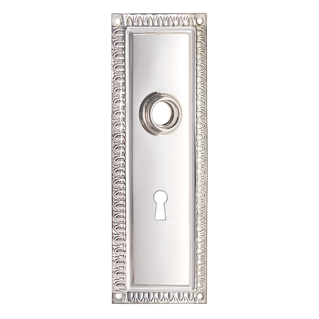 8767-K-PN Wrought brass trim plate (escutcheon) for doors – egg & dart pattern Finish/Color: Polished NickelMaterial: Solid BrassDimensions: 2-1/2" X 7"Finish Options: BN | PB | PL | PN | OBTimeline: Late 19th Century, Early 20th Century SKU: 8767-K-PN-466 Category: Door Plates Tag: Polished Nickel Description Description Refined door trim (escutcheon) plate with hub and keyhole. Egg & dart pattern. Wrought brass. In 5 Finishes: PB, PL, PN, BN and OB. 7″ high , 2-1/2″ wide 2-1/4″ spacing (hub to keyhole)