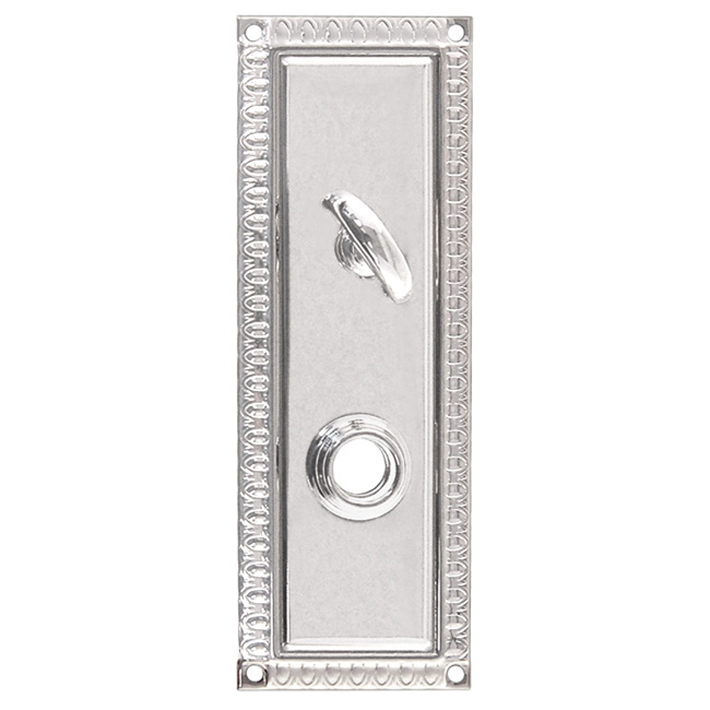 Solid brass rectangular door trim plate with crescent thumb turn. Egg & dart pattern. For thumb turn and doorknob. Wrought brass. In 5 Finishes: PB, PL, PN, BN, OB.