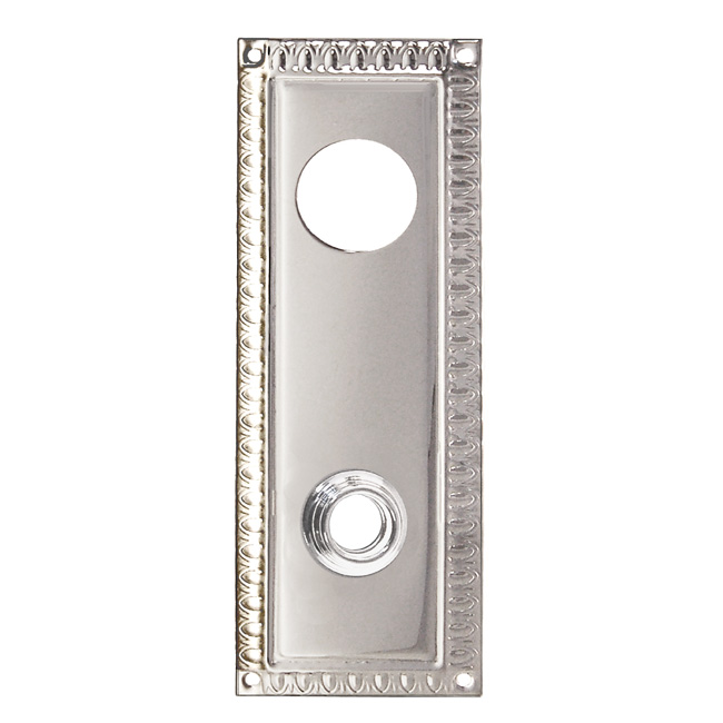 8769-PN Wrought brass trim plate (escutcheon) for doors Finish/Color: Polished NickelMaterial: Solid BrassDimensions: 2-1/2" X 7" platesFinish Options: BN | PB | PL | PN | OBTimeline: Late 19th Century, Early 20th Century SKU: 8769-PN-476 Category: Door Plates Tag: Polished Nickel Description Description Solid brass rectangular door trim plate for doorknob and keyway cylinder . Egg & dart pattern. Wrought brass. In 5 Finishes: PB, PL, PN, BN, OB. Keyway cylinder sold separately. 2-1/2″ wide , 7″ high 3-7/16″ center to center spacing
