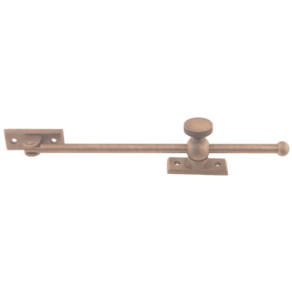 Casement window adjuster. Authentic traditional look. Solid brass. With beveled plates, knurled knob and encased plastic sleeve to prevent marks on rod. Installed with sash plate toward hinge side of window. Reversible for right or left-hand windows opening out.