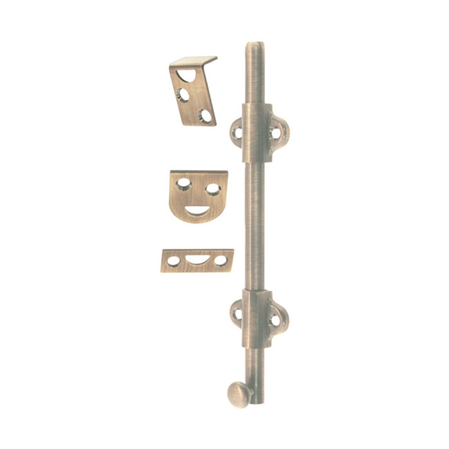 Surface bolts for windows, French windows and doors. Solid brass. Available in 4 lengths (2″, 4″, 6″, 8″) and in 5 Finishes: PB, AB, PN, BN, OB. They come with 3 strikes: universal strike, mortise strike, angle strike. They have two guide brackets (stays).
