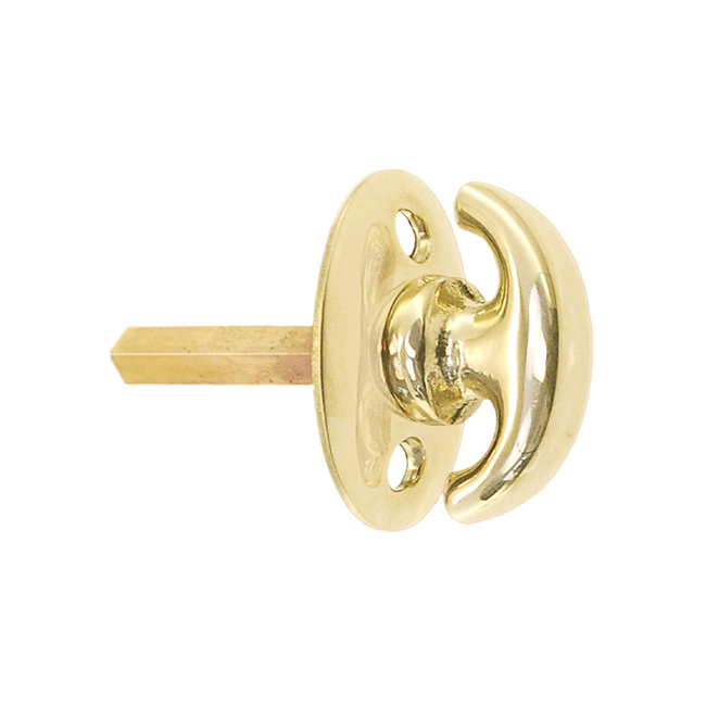 Crescent thumb turn for locking doors on the inside. Stamped brass raised oval plate. Smaller size In five finishes. Old style thumb turns for mortise locks, night locks, catches etc.