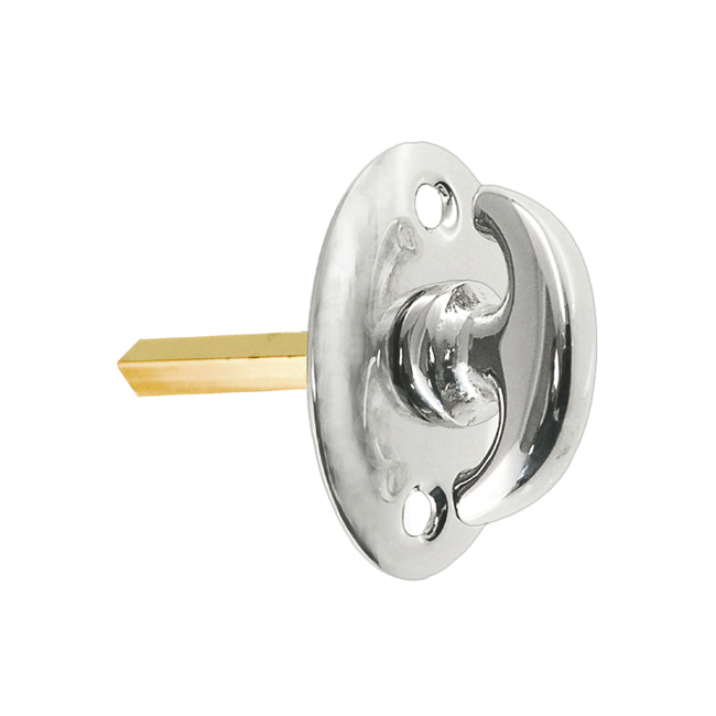 Crescent thumb turn for locking doors on the inside. Stamped brass raised oval plate. Larger size. In five finishes. Old style thumb turns for mortise locks, night locks, catches etc.