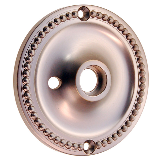 8875-A-BN Very large forged brass beaded doorknob rose – privacy function Finish/Color: Brushed NickelMaterial: Solid BrassDimensions: 3-1/4" diam. Finish Options: BN | OB | PB | PN | PLFeatures: Will fit on pre-drilled doors SKU: 8875-A-BN-588 Category: Door Roses Tag: Brushed Nickel Description Description Extra large privacy doorknob rose with rope design (beaded). Forged brass. In 5 Finishes: PB, PL, PN, OB, BN. Will fit over the standard 2-1/8″ predrilled hole in door. Privacy function. 3-1/4″ diam. , 2-15/16″ center to center