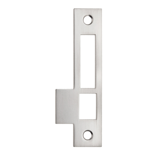 Medium sized strike plate for interior doors. Will fit most interior doors. Solid brass. In 5 Finishes: polished brass, lacquered polished brass, polished nickel, brushed nickel and oil rubbed bronze.
