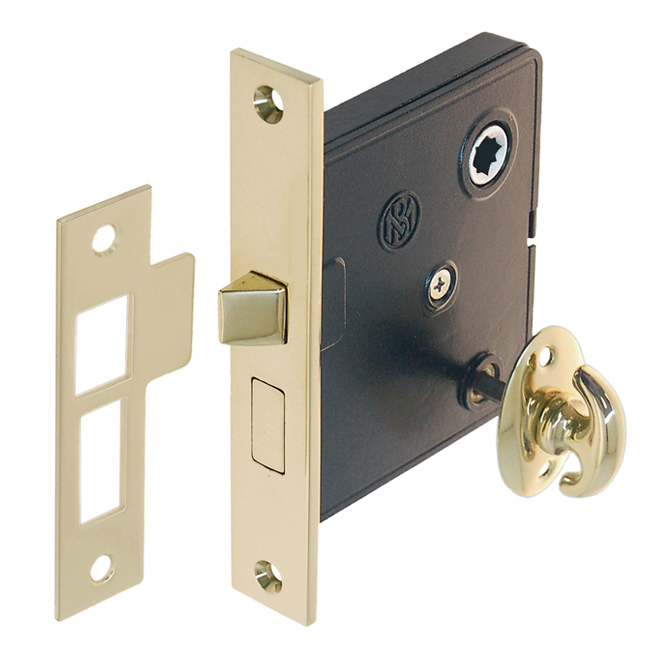 Authentic old-style tumbler lock with japanned case for interior doors. Sold with solid brass strike plate and thumb turn. Available in 3 finishes for the plates/thumb turn. Add any doorknobs, roses and trim plates (sold separately) to form complete door sets.