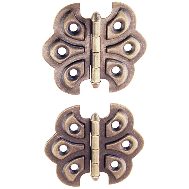 1560-AB Ornamental, embossed “butterfly” hinges Finish/Color: Antique BrassMaterial: steelDimensions: 2-3/8" X 2-1/4"Finish Options: AB | AC | OB | PB | PNTimeline: Early 20th CenturyFeatures: With removable pin SKU: 1560-AB-1729 Categories: Hinges, Steel Tag: Antique Brass Description Description Embossed ornamental hinges have been very common for furniture and cabinets since the late 19th century onward. Made of steel. Full surface, flush mount hinges. 2-3/8″ X 2-1/4″ Sold in pairs.