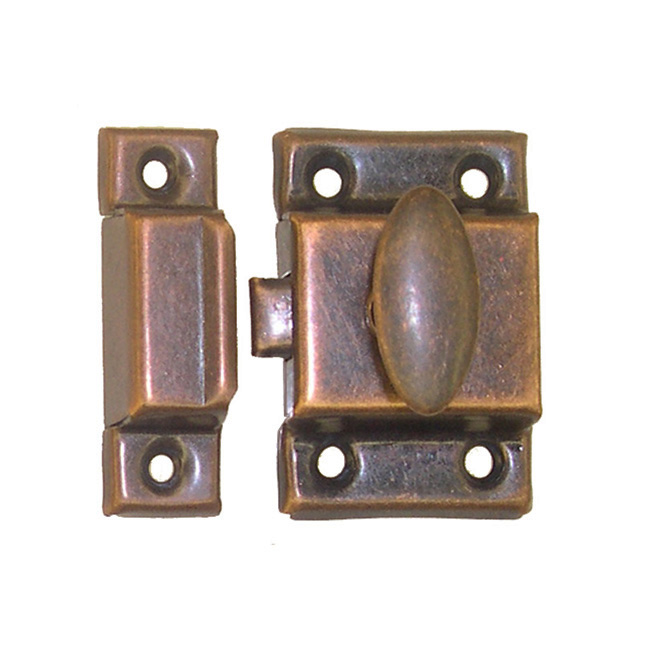 1617-AC Utility Latch & strike for cabinet doors – small Finish/Color: Antique CopperMaterial: SteelDimensions: 1-1/4" + 5/8" X 1-7/8"Finish Options: AB | AC | PB | PN | OBTimeline: Early 20th CenturyFeatures: Inexpensive utility latch SKU: 1617-AC Categories: Latches, Steel Tag: Antique Copper Description Description A utility latch for “Country” or rustic furniture. Widely used on pine or patio furniture. Made of stamped steel. Comes in 5 finishes and 2 sizes. This is the smaller size. Latch: 1-1/4″ X 1-7/8″ Catch: 5/8″ X 1-7/8″