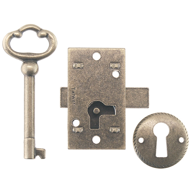 6536-AB Non-mortise (surface) lock for wardrobes and cabinets – small Finish/Color: Antique brassMaterial: SteelDimensions: 1" X 1-3/4"Finish Options: AB | PBTimeline: Late 19th Century, Early 20th Century SKU: 6536-AB-2191 Categories: China Cabinet, Locks and Keys, Steel Description Description Non-mortise cabinet lock commonly known as “Wardrobe” lock. Bolt shoots right and left. Steel. Antique brass finish. Includes key and a keyhole cover. Small. Plate size: 1″ X 1-3/4″