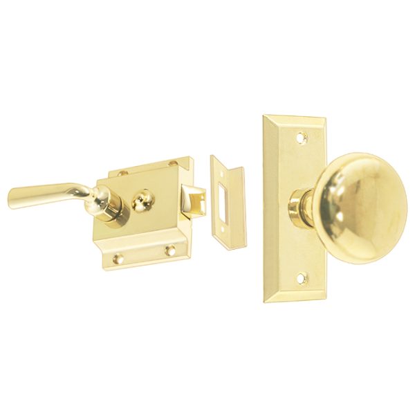 Complete screen door latch set with lever on the inside and knob on the outside. Button can lock latch in either position. Comes with reverse bevel and an angle strike. Bevel is reversible. Works on both right and left-handed doors. For door thickness from 7/8″ to 1-3/4″. Includes hex key for set screws.