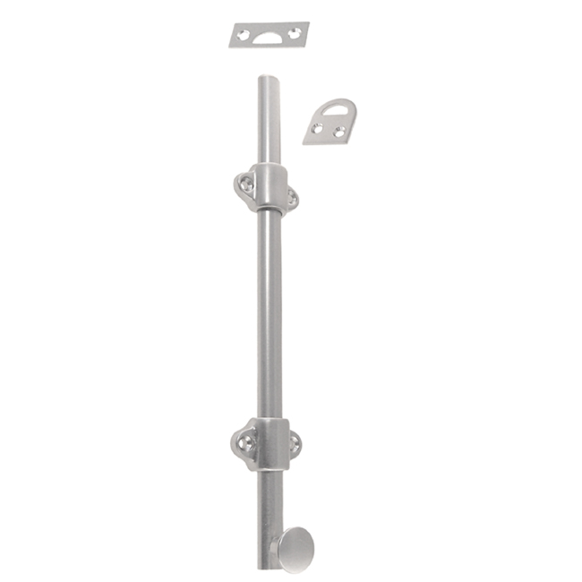 8722-BN Surface bolt Finish/Color: Brushed NickelMaterial: Solid brassDimensions: 9" longFinish Options: AB | PB | PN | OB | BN SKU: 8722-BN-855 Categories: Surface Bolts, Surface Bolts, Window Hardware Description Description Surface bolt for windows, French windows, doors. Solid brass. Available in 3 lengths and 5 finishes. Comes with 2 strikes. 9″ long , 1/2″ diameter half-rod 1-3/8″ wide guide brackets (stays) , 3/4″ knob diameter