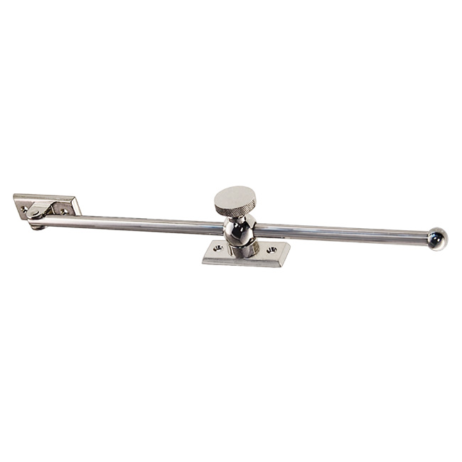Casement window adjuster. Authentic traditional look. Solid brass. With beveled plates, knurled knob and encased plastic sleeve to prevent marks on rod. Installed with sash plate toward hinge side of window. Reversible for right or left-hand windows opening out.