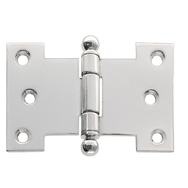 Parliament hinge. Solid brass. For shutters, windows, doors that need clearance from wall. With heavy-gauge (3/32″ thick) swaged leaves. Solid brass. In 4 finishes. Stainless steel removable pins with ball tips. Reversible.