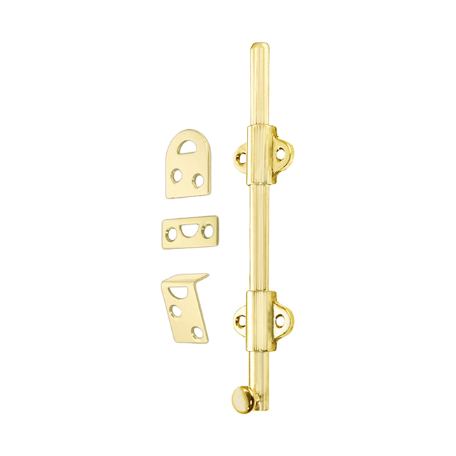 Surface bolts for windows, French windows and doors. Solid brass. Available in 4 lengths (2″, 4″, 6″, 8″) and in 5 Finishes: PB, AB, PN, BN, OB. They come with 3 strikes: universal strike, mortise strike, angle strike. They have two guide brackets (stays).