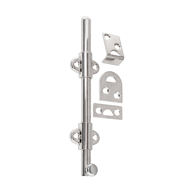 Surface bolts for windows, French windows and doors. Solid brass. Available in 4 lengths (2″, 4″, 6″, 8″) and in 5 Finishes: PB, AB, PN, BN, OB. They come with 3 strikes: universal strike, mortise strike, angle strike. They have two guide brackets (stays).