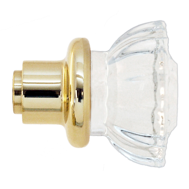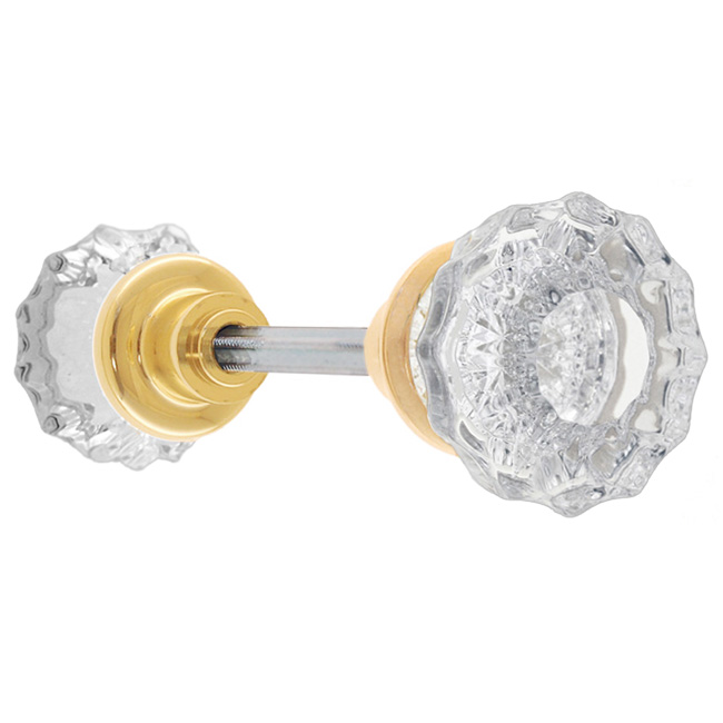 Fluted clear glass doorknobs. High quality pressed glass knobs with solid brass bases. Rim of brass base folds over base of glass knob for secure grip. Silver foil under glass amplifies reflected light to show beautiful facets. Set includes 2 knobs, steel spindle and an Allen (hex) key for set-screw adjustment.