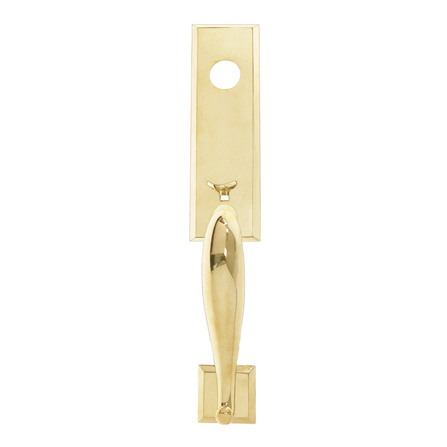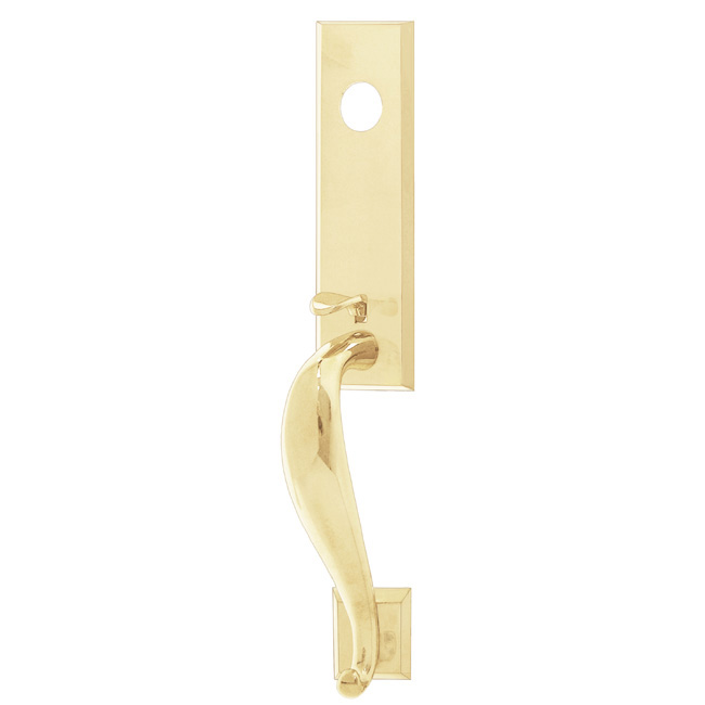 Entrance door handle with thumb piece used on the exterior side of the door to operate a mortise lock. Comes complete with fasteners (keyway cylinder sold separately). Solid brass. Available in 5 finishes.