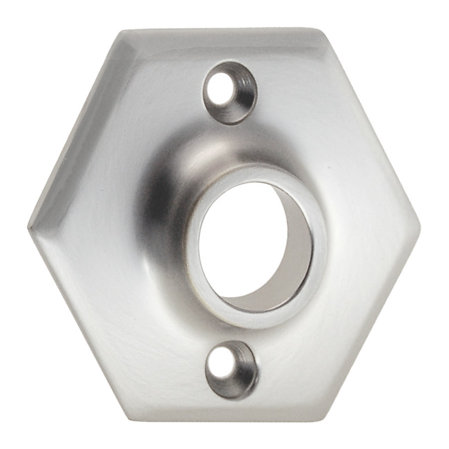 8876-BN Hexagonal forged brass doorknob rose Finish/Color: Brushed NickelMaterial: Solid BrassDimensions: 2-1/2" diam.Finish Options: BN | OB | PB | PN | PLTimeline: Mission, Arts & Crafts SKU: 8876-BN-598 Category: Door Roses Tag: Brushed Nickel Description Description Mission or Arts & Crafts doorknob rose. Hexagonal. Forged brass. In 5 Finishes: PB, PL, PN, OB, BN. Early 20th century style. 2-1/2″ diam. , 1-1/2″ center to center