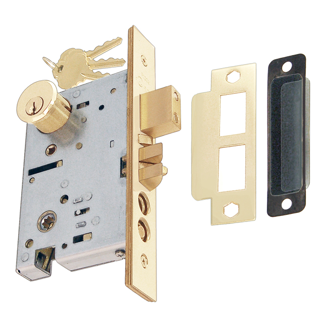 Anti-friction latch and auxiliary (guard) latch. Cylinder plug. Stop/release buttons. Deadbolt has 2 saw-proof hardened steel inserts. Face plate detachable to set cylinder keyway and plug – and to reverse handing. Locks are field reversible (shipped right-handed).